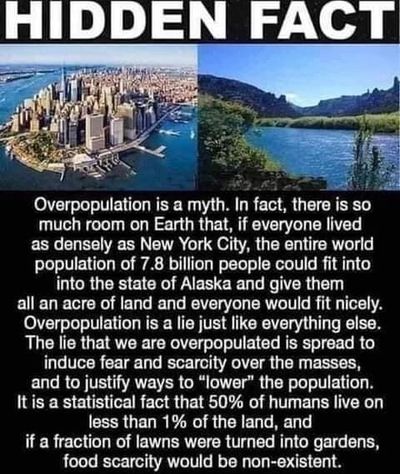 Today, there is approximately 7,268,730,000 people on earth. The landmass of Texas is 268,820 square miles (7,494,271,488,000 square feet). If we divide 7,494,271,488,000 square feet by 7,268,730,000 people, we get 1031 square feet per person. This is enough space for everyone on earth to live in a townhouse while altogether fitting on a landmass the size of Texas. And we’re not even accounting for the average four-person family who would most likely share a home!" In regards to the most pervasive idea of the direct relationship between the number of people and the carbon footprint, that lead master Bill to openly advocate the necessity of reducing the population in order to save the planet, please check out the following...- Debunking the Myth of Overpopulation