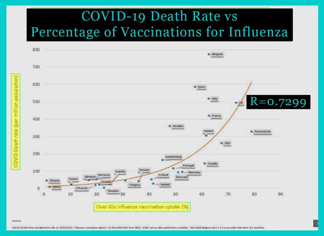 - Even more, an analysis of the incidence of flu vaccination among the elderly (+65) and deaths per million in the European countries + UK, shows a high positive corelation!...: Correlation Coefficient COVID Deaths & QIVc Flu Shots: http://qplusnews.com/correlation-coefficient-covid-deaths-qivc-flu-shots